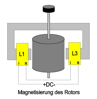 vielen Dank für Ihre Mühe, sich mit der Materie zu befassen. Der Bau eines Rotors ist natürlich eine aufwendige Sache. Wie ich den Besitzer kenne, ist das nicht in seinem Sinn. Er möchte das Gerät originalgetreu instand setzen. Auch meine Meinung ist, da ja alles vorhanden ist müsste es doch möglich sein, den Rotor neu zu magnetisieren. Wenn Sie schreiben, dass ein Körper in jede Richtung magnetisierbar ist, könnte ich mir vorstellen den Rotor mit Hilfe der eingebauten Spulen zu magnetisieren. Dazu eine Prinzipzeichnung: