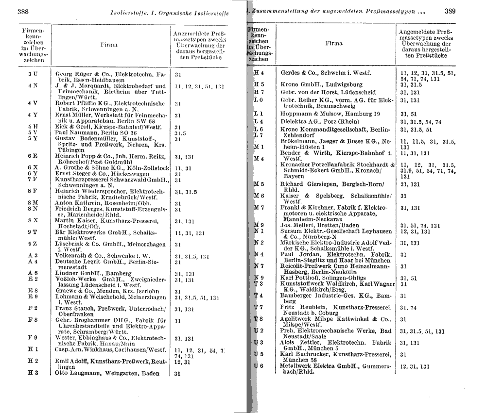 Der VDE entwickelte als erster Richtlinien zur Typisierung. Im Jahr 1924 schließlich wurde die Technische Vereinigung der Hersteller typisierter Preßmassen und Preßstoffe (T.V.) gegründet, die spätere Technische Vereinigung der Fabrikanten gummifreier Isolierstoffe. Ihre Mitglieder unterzogen sich seit 1924 einer freiwilligen Prüfung durch das Staatliche Materialprüfungsamt in Berlin-Dahlem. In dem Prüfzeichen identifiziert ein zweistelliger Code über dem stilisierten M das Presswerk, der Code unter dem M die Art der Pressmasse. Das Prüfzeichen stellt stilisiert die Buchstaben MPAD dar (Materialprüfungsanstalt Berlin-Dahlem)