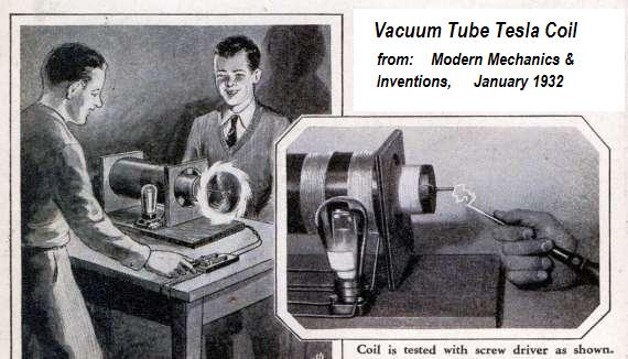 Very near to radio and simple to build - with radio parts - is the homebrew Reinartz Moduloscope. Sometimes it is also called vacuum tube Tesla coil. Philip Colston, Setauket, USA, was so kind to send me an OCR scan from "Modern Mechanics" of 1932 of the article how to build an other version. I can just use his scan and will add some pictures from the journal.