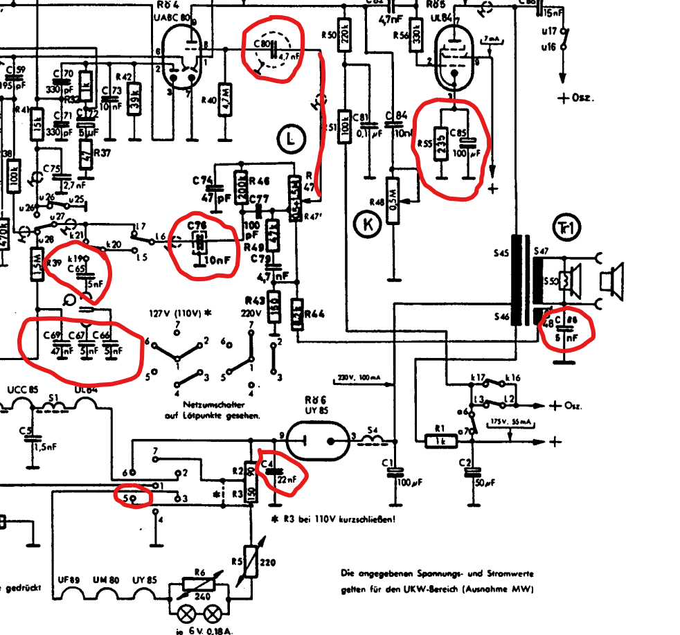 Der Katoden - Kondensator C85 100uF der Endröhre UL84 wies eine komplett herausgedrückte Gummidichtung auf. Beim Auslöten dieses Kondensators zerbrach der zugehörige Drahtwiderstand R55 235Ohm sofort. Und das obwohl der Widerstandswert eigentlich in Ordnung war. Dieser Widerstand war demzufolge einer extremen Überlastung ausgesetzt. Das alles beweist das hier einmal viel zu viel Katodenstrom durch die UL84 geflossen sein muss. Und tatsächlich der Gitterkondensator C82 4.7nF wies einen Widerstand von ca. 10M auf, was ntürlich die Ursache für den viel zu grossen Katodenstrom war. An den Lötstellen und am Typ war gut sichtbar, das dieser Kondensator bereits schon früher einmal ersetzt wurde. Der Katodenwiderstand R55 habe ich durch zwei Parallel geschaltete 470Ohm Typen ersetzt was dem ursprünglichem Wert von 235Ohm entspricht. Spätere Messungen zeigten das die UL84 keinen Schaden genommen hat, die Ströme waren sogar im oberen Bereich. (Die Röhre sieht auch ziemlich neu aus).