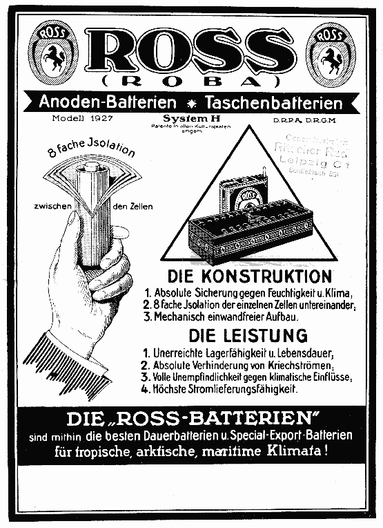 Die Firma stellte u.a. Anodenbatterien unter den Markennamen ROSS, ROBA und DIAMANT in den 1920er Jahren her (Prospekt aus 1927).