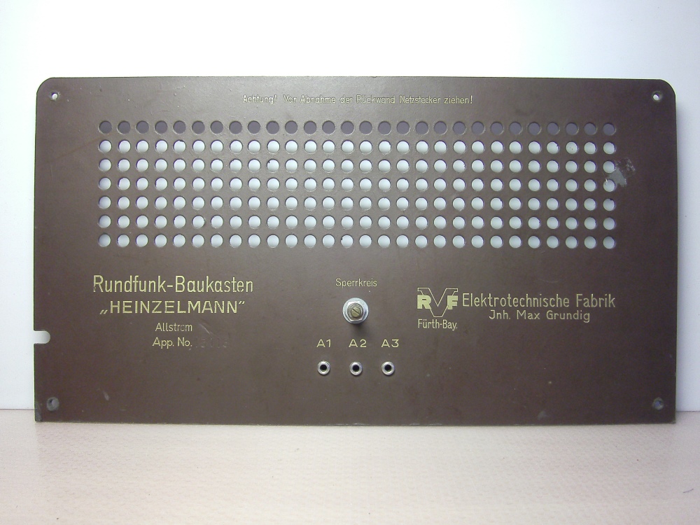 - V-Röhren: Sie waren für die Fertigung vor 1948 legal nicht beschaffbar, was auch für eine Firma wie RVF galt. Die Allstrom-Heinzelmänner waren bis 1948 immer mit 2x RV12P2000 und danach mit UF6, UL2 und UY3 bestückt.