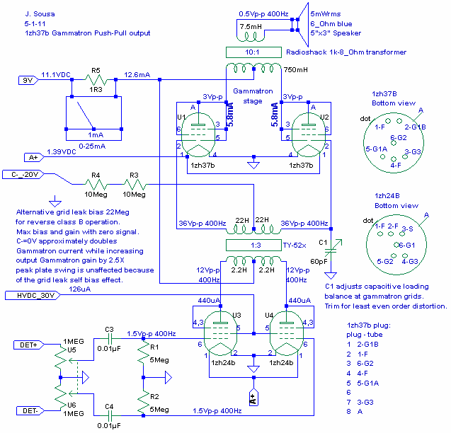 The low mu=0.4 and low gm=750uS in this configuration requires up to 72Vp-p of differential drive at the Gammatron input control rods.