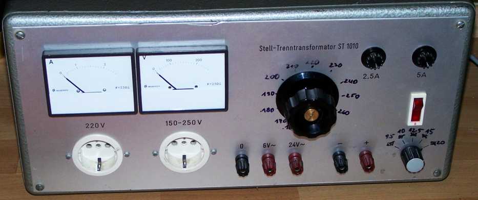 ich besitze einen Stell-Trenntrafo der Firma Hinzen (hier nicht gelistet) von der ich nicht mehr weiss als den Namen. Der Trafo ist lt innerem Prüfstempel von 1970-72. Kennt jemand diesen Trafo oder die Firma? Da ich den Schaltplan dieses Gerätes benötige um es zu reparieren. der trafo hat 2 Steckdosen 1x permanent 220v + 1x regelbar 150-250v, Messkabelanschlüsse 1x 6v, 1x 24v, 1x Regelbar 6-24v, Anzeige 1x Amperemeter + 1x Voltmeter