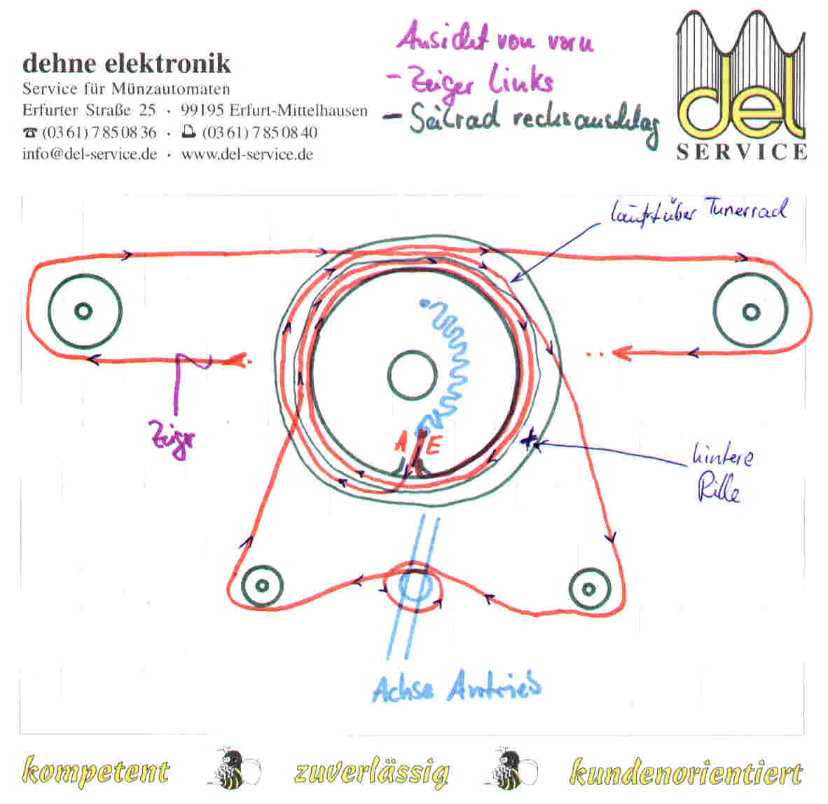 habe gerade ein Einbauchassis vor mir. Die Herausforderung ist das Seil von links (Zeiger / Umlenkrolle / hinten) kommend über das Seilrad vom Tuner in der vorderen Rille zum unteren rechten Umlenkrad zu legen.