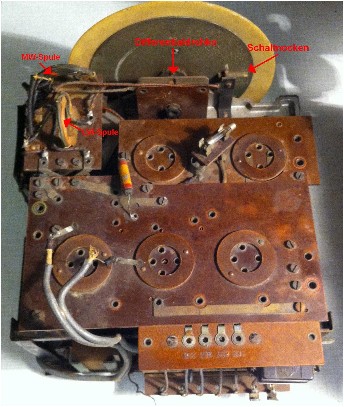 Links hinten erkennt man die Vorwiderstände des Grammophonmotors. Im linken Teil der größen Höhlung auf der Gehäuseoberseite liegt die Tragplatte des Grammophons.