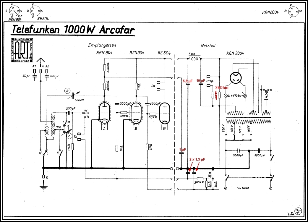 Schaut man sich die für dieses Gerät verfügbaren Schaltungen an, so stellt man mit großer Enttäuschung fest, dass die meisten schwerwiegende Fehler enthalten oder einige Bauteile keine oder fehlerhafte Wertangaben haben. Dabei ist die Schaltung wirklich bestechend einfach. Auf ein rückgekoppeltes Audion mit einer REN904 folgt eine 2. Röhre REN904 als NF-Ververstärker und eine RE604 als Leistungsverstärker.