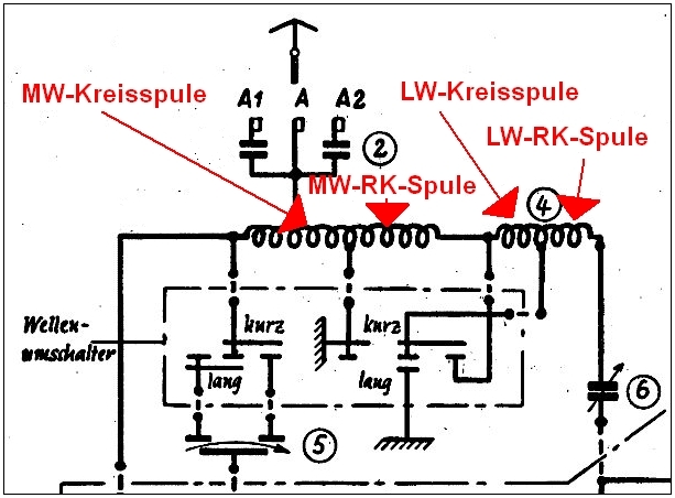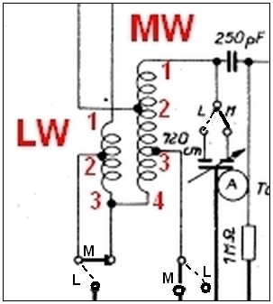 MW-RK-Spule: der zwischen den Anschlüssen 3 und 4 liegende untere Abschnitt der rechten Spule. Dieser RK-Spule liegt der obere Teil der linken Spule zwischen den Anschlüssen 1-2 als Drosselspule in Reihe. (Die Sektion 2-3 der LW-Spule wird ja bei MW über den linken Schalter kurzgeschlossen.)