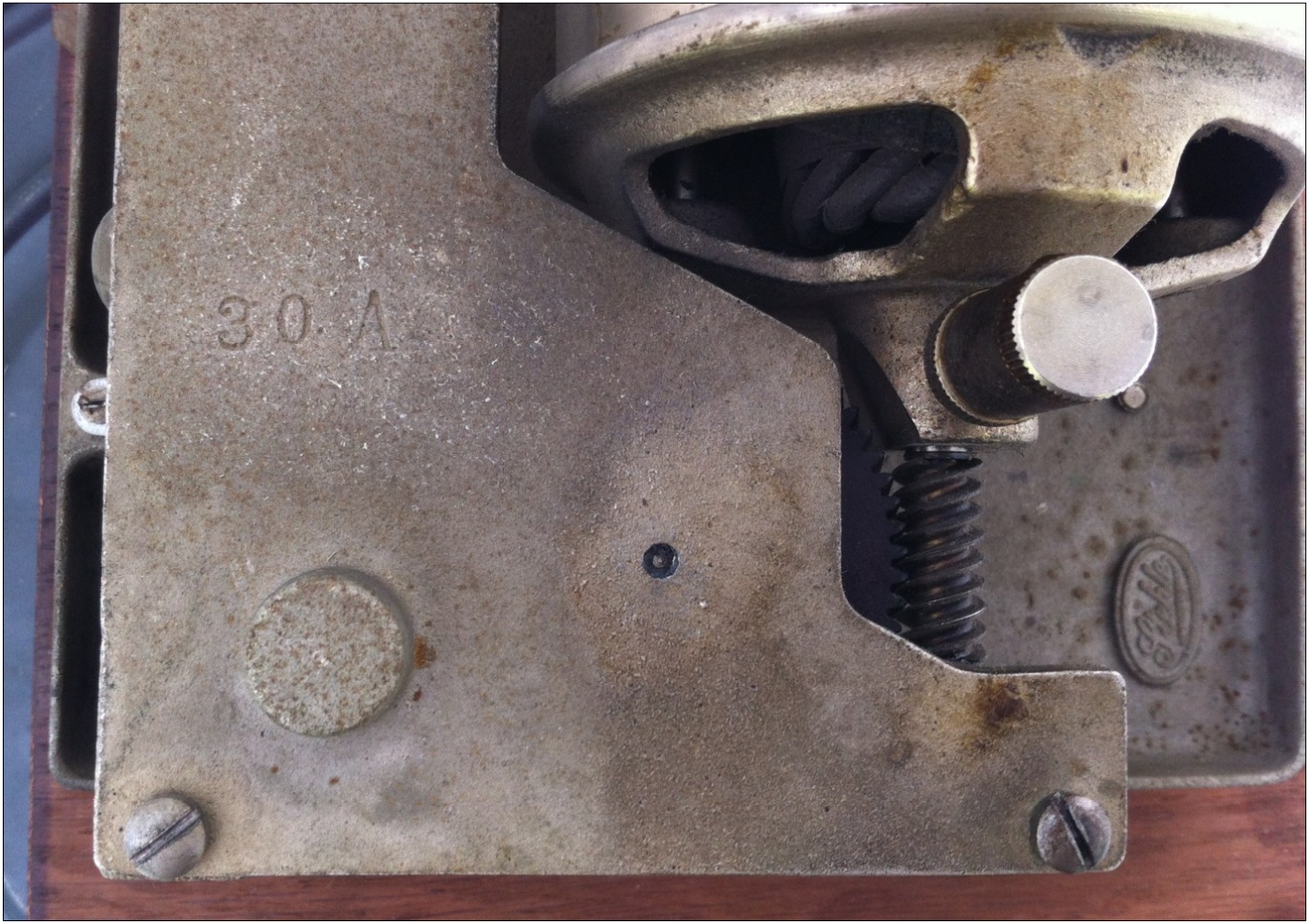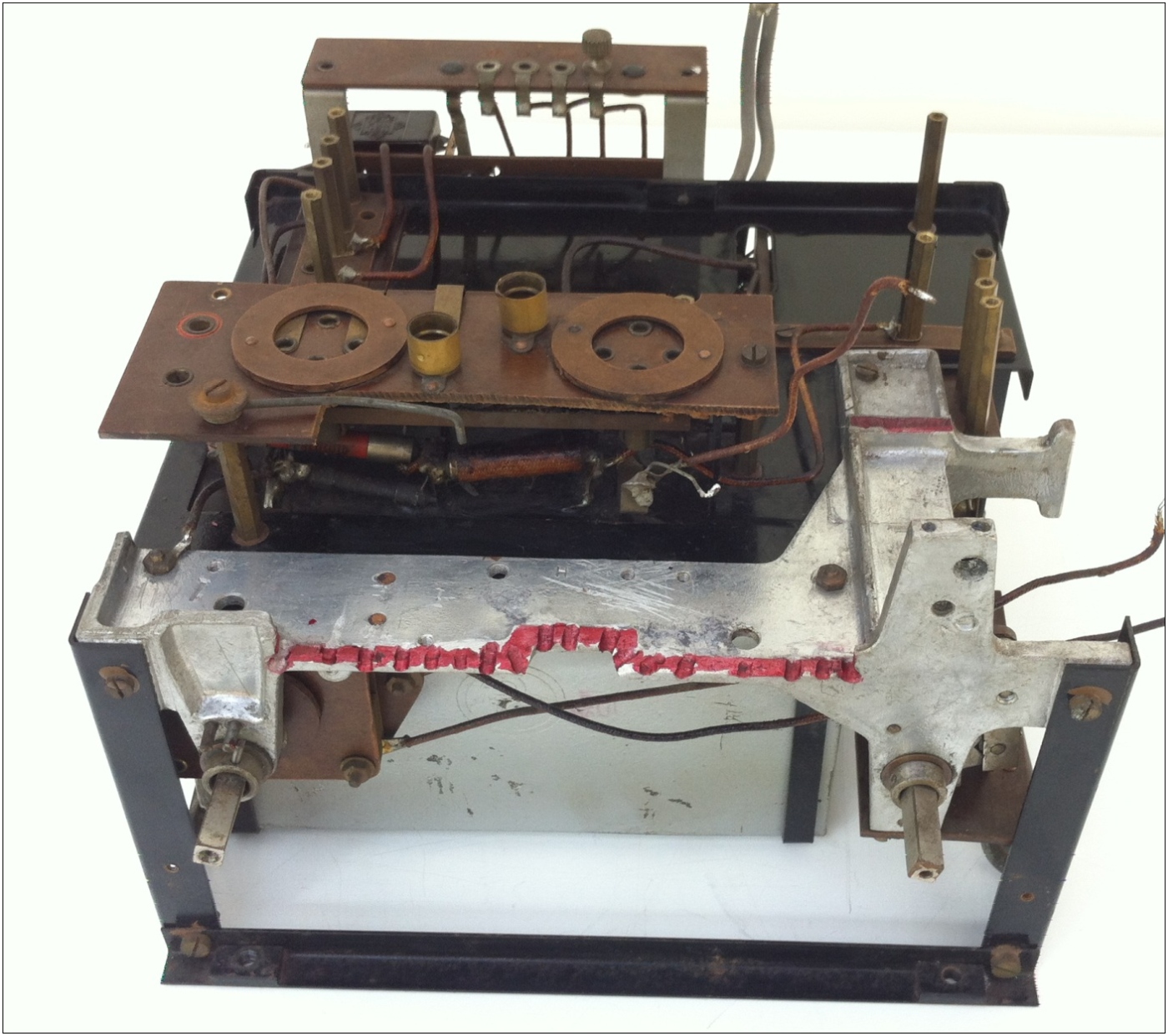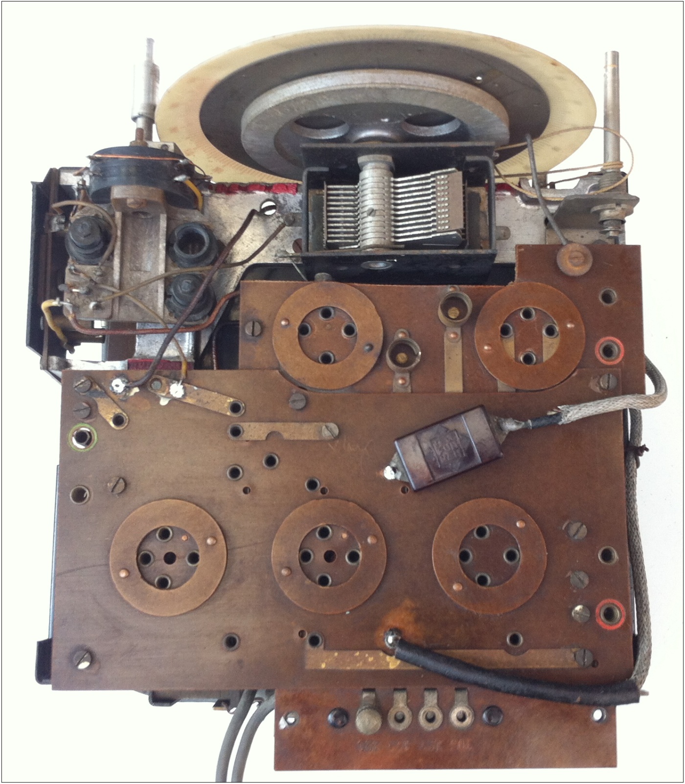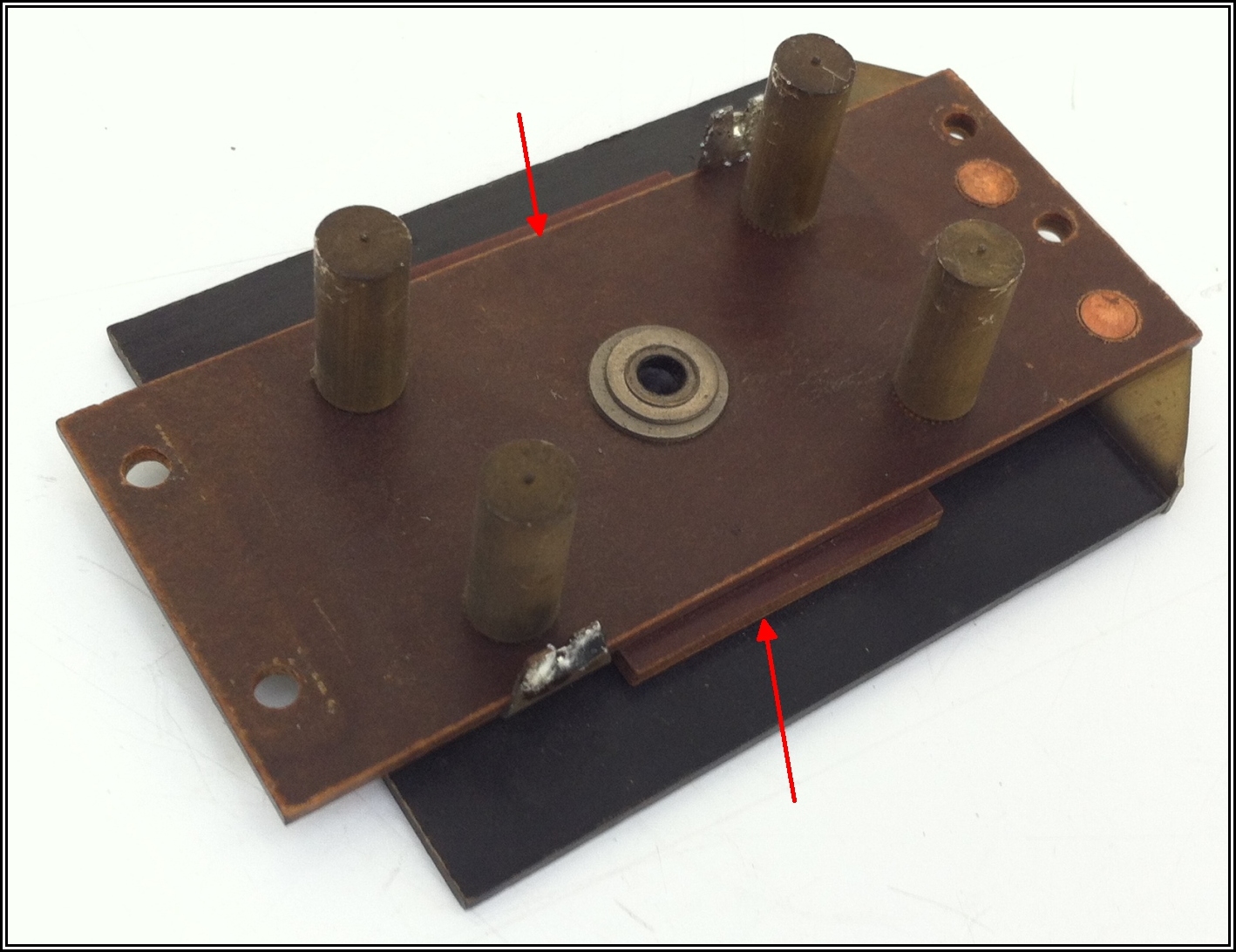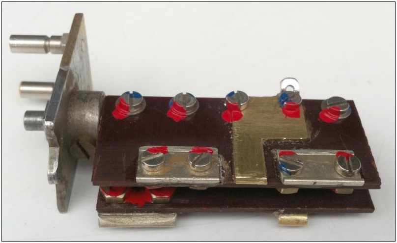Ebenfalls gut erkennbar sind die zur Verbindung der einzelnen Schaltpunkte verwendeten Messingstreifen. Solche Streifen gibt es auch auf der Unterseite der Platine - die Kontaktierung zwischen oberen und unteren Streifen erfolgt durch Hohlnieten. Eine frühe Version eines double-layer printed circuit board. Unglücklicherweise sind diese Kontaktierungen über die Jahre häufig korrordiert und verursachen mysteriöse Funktionsfehler.