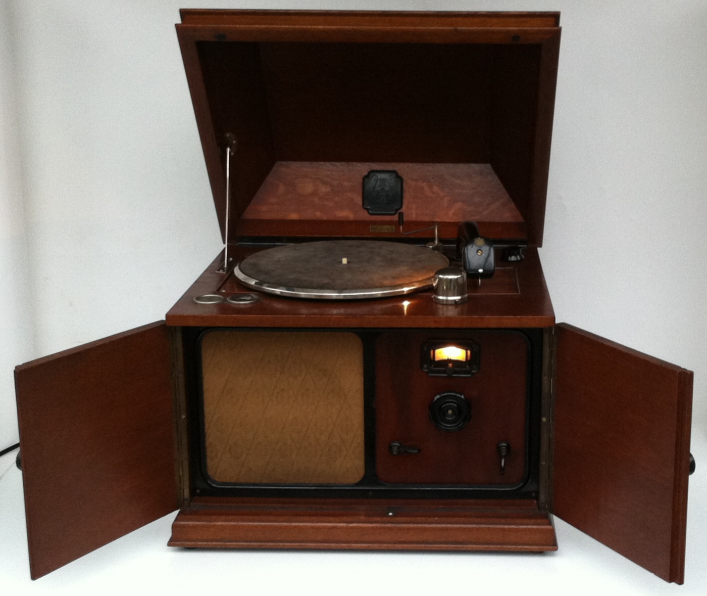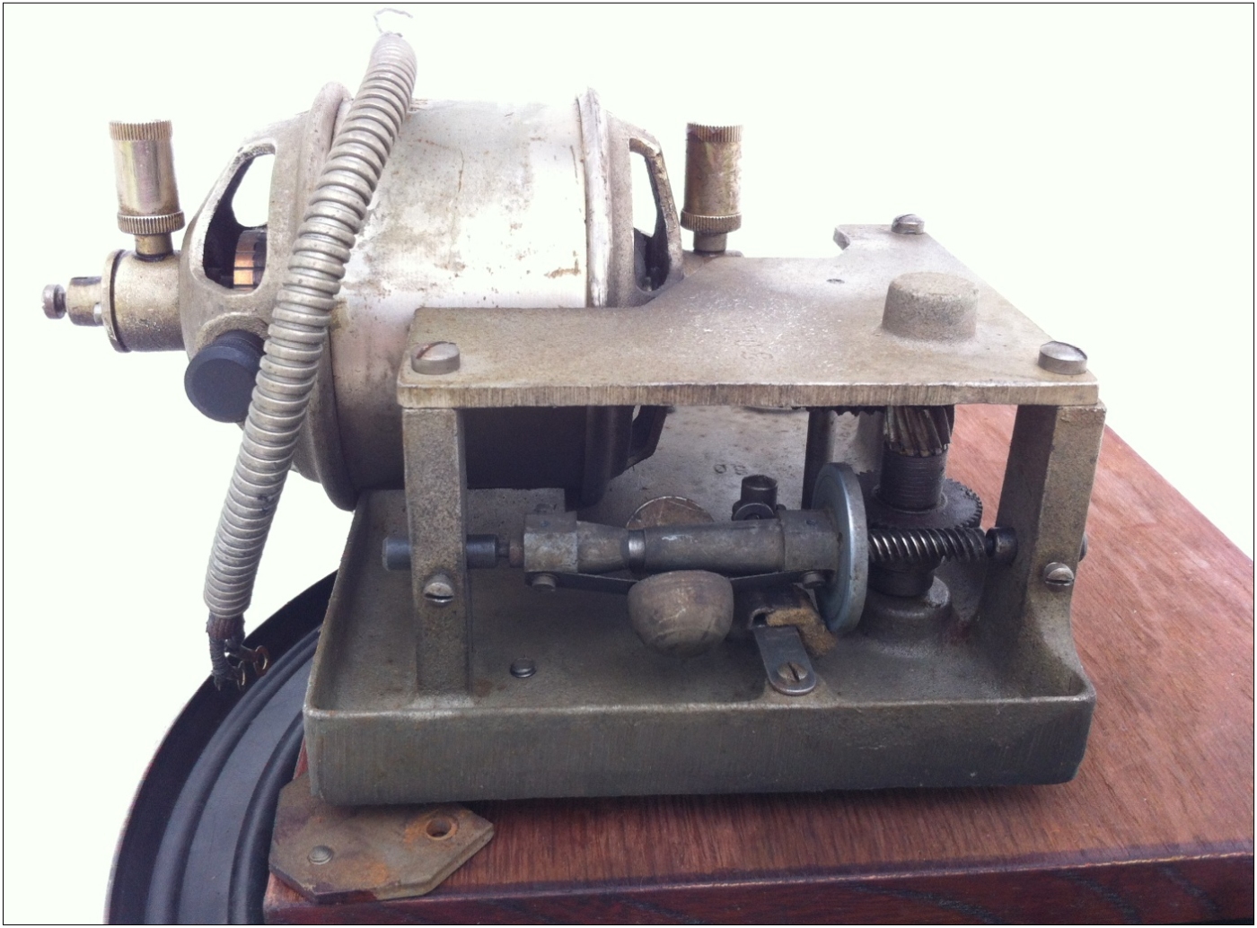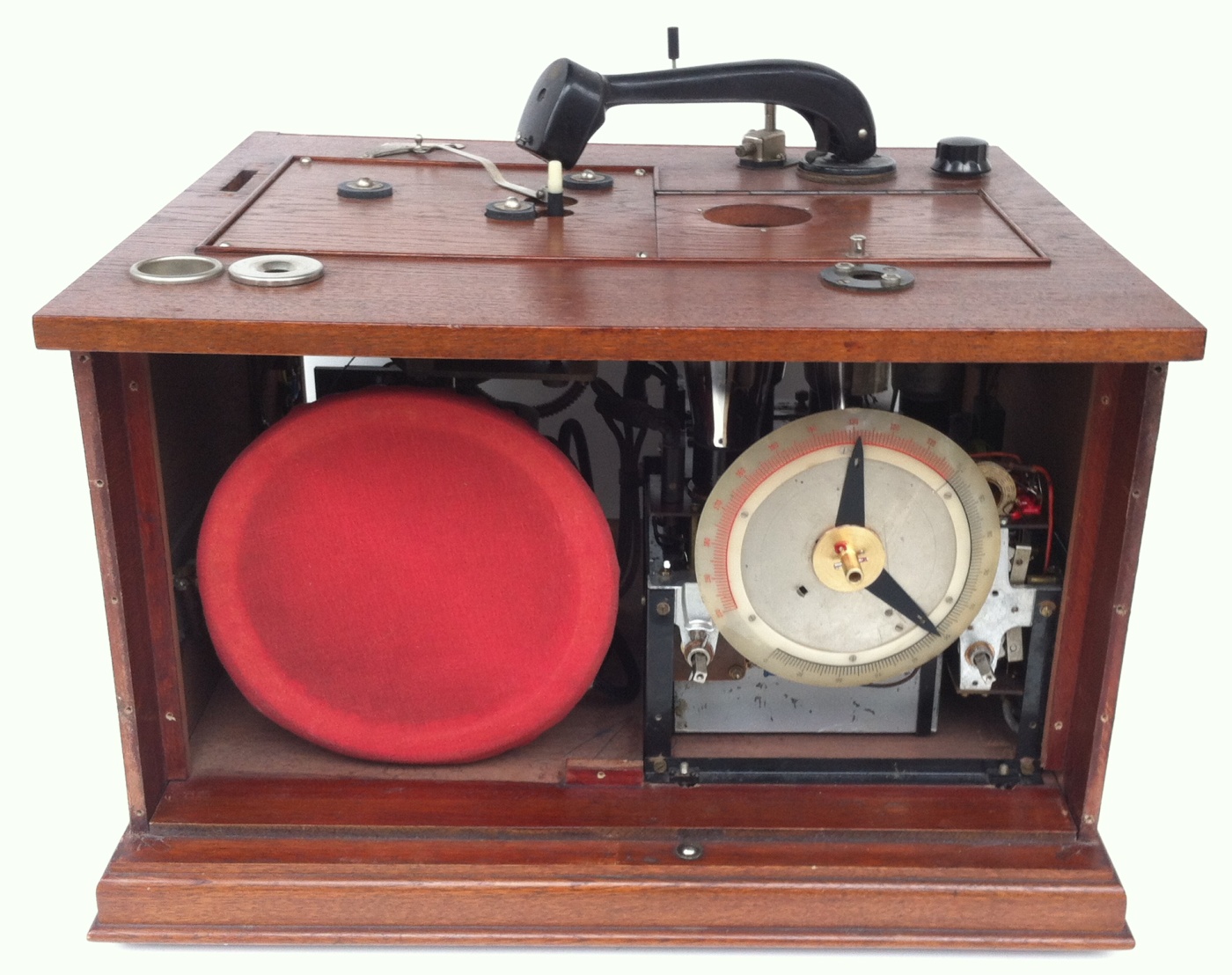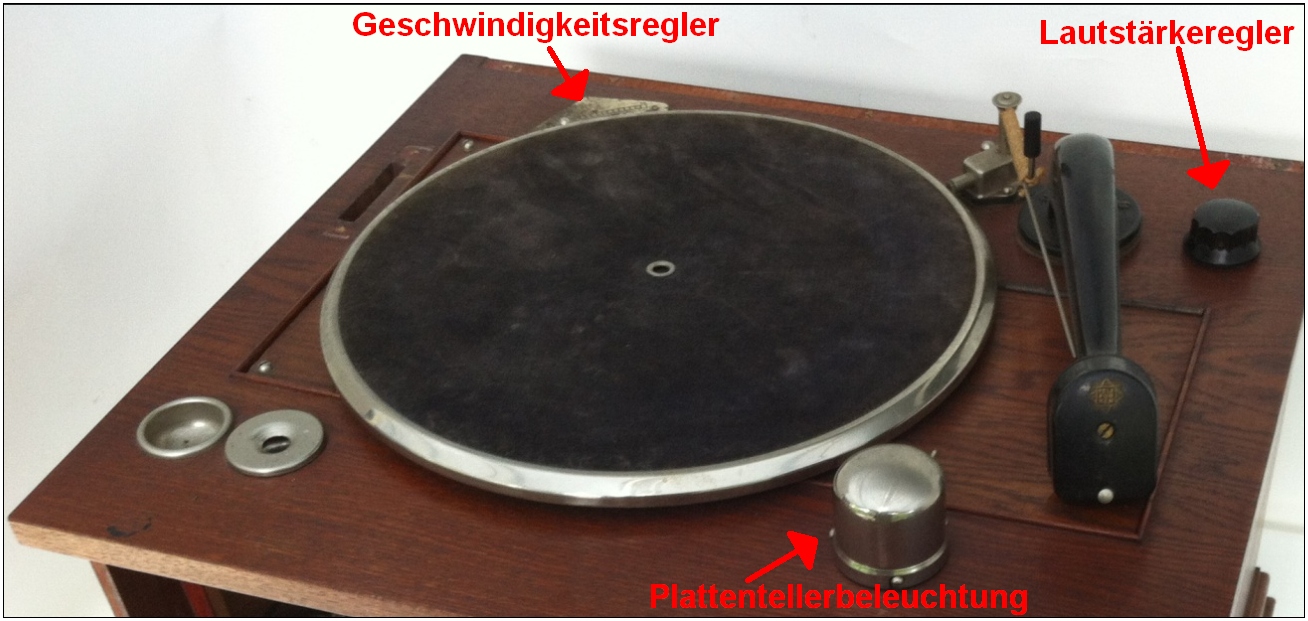 3. das elektrisch betriebene Grammphon mit Stufenschalter (rechts im Bild) und Vorwiderständen zur Anpassung an unterschiedliche Netzspannungen.