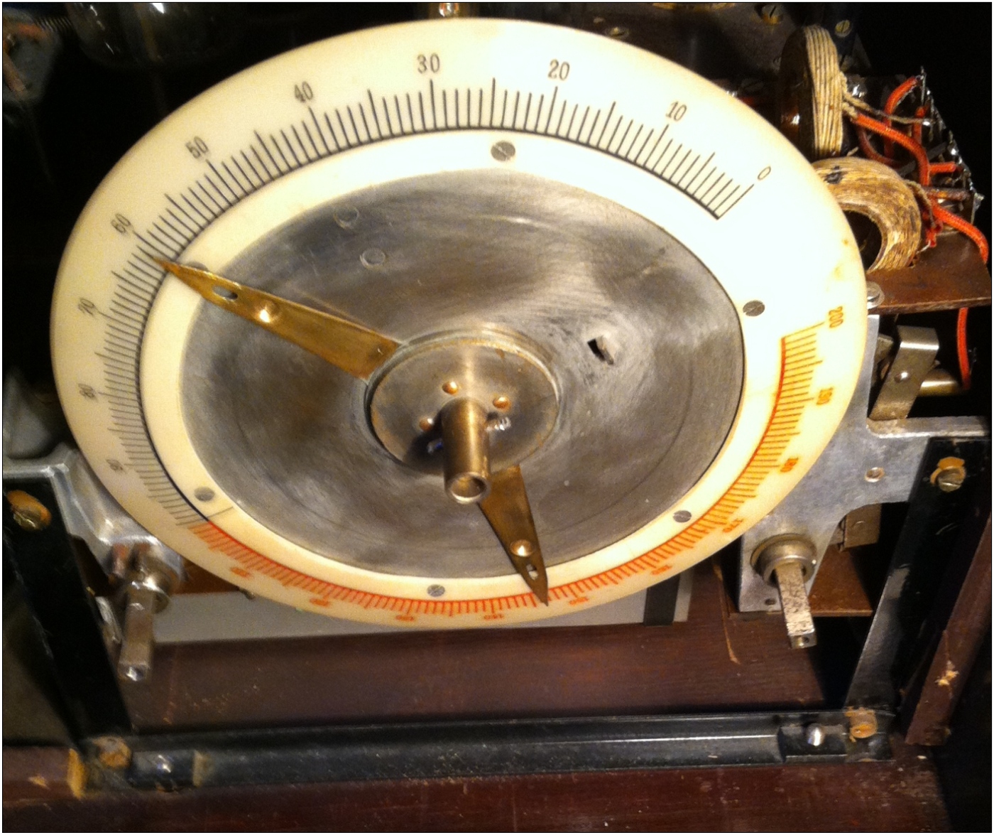 Unterhalb der Skalenscheibe sieht man 2 Vierkant-Achsstummel. Der linke gehört zum Rückkopplungsdrehko, der rechte zum Betriebsartenschalter (3 Stellungen: AUS, Radio, Grammophon)