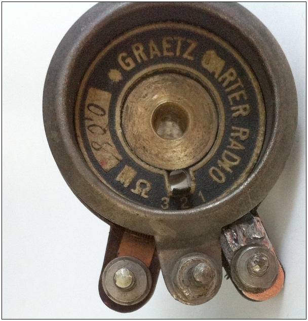 Als Lautstärkeregler fand ein 80kΩ Drahtpoti des Herstellers GRAETZ-CARTER Verwendung. Diese Drahtpotis sind berüchtigt dafür, dass sich der Widerstand ihres Drahtwickels über die Jahre dramatisch erhöht - ein Faktor 5 über dem Sollwert wurde schon beobachtet. In meinem Gerät war darüber hinaus eine der beiden Kontaktierungen (Cu-Streifen) des Widerstandswickels abgerissen und musste ergänzt werden: