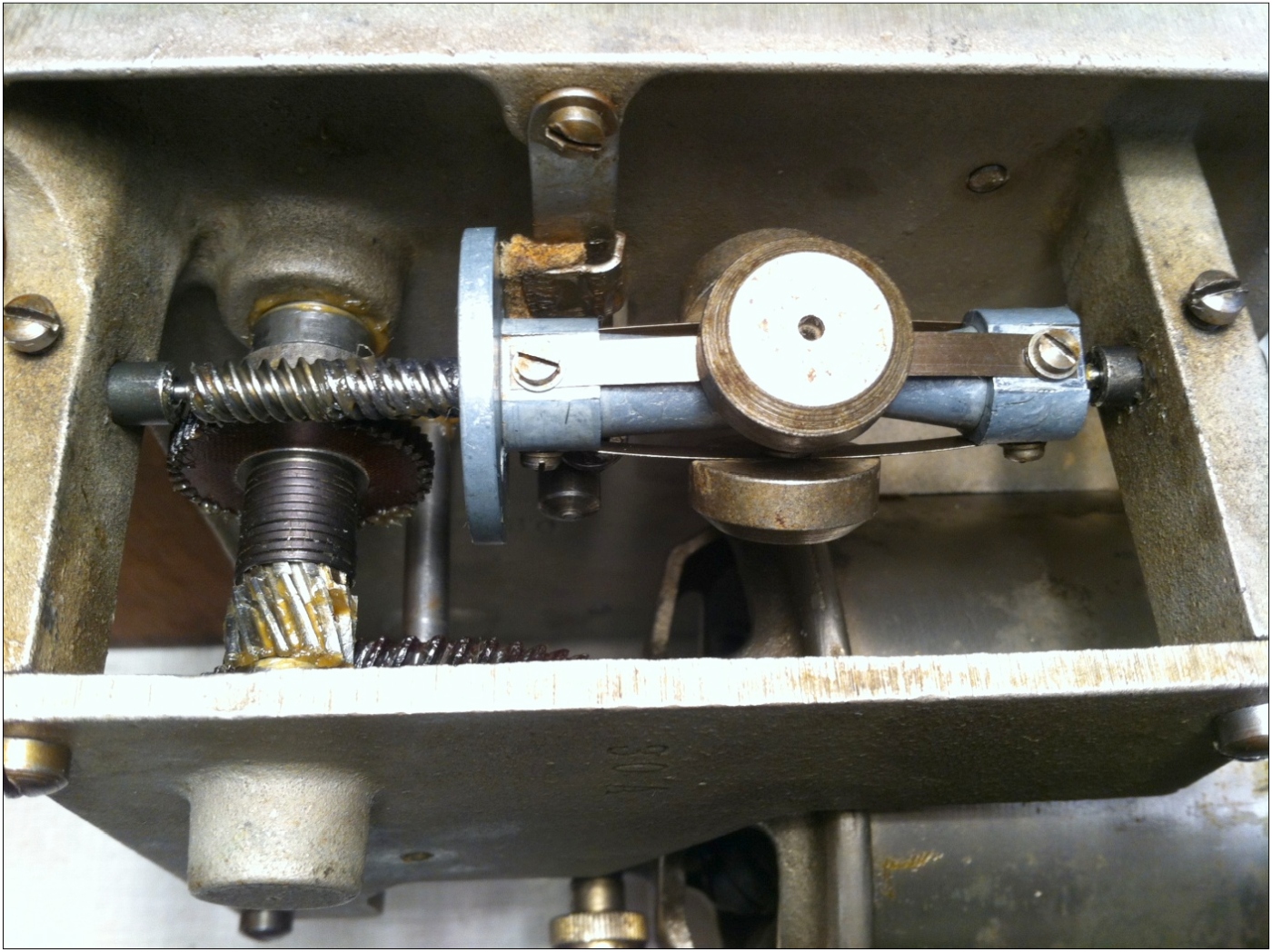Das in der Abbildung noch fehlende 3. Gewicht des Fliehkraftreglers wurde im Verlauf der Restaurationsarbeiten ergänzt.