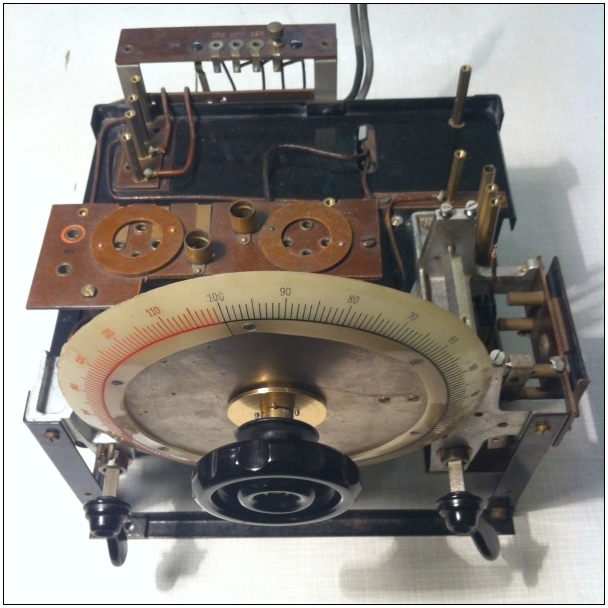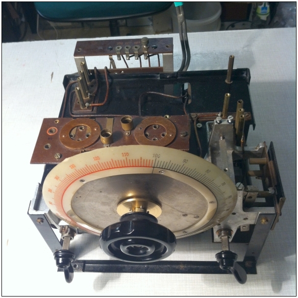 In der Rückansicht sieht man oben wieder die Skalenscheibe mit dem Schaltnocken der gerade an dem von hinten gesehen rechten Anschlag liegt. Auch der Differential-Abstimmdrehko ist gut erkennbar. Links oben im Bild sieht man die beiden Spulen des Audion Eingangs. Diese werden im folgenden Abschnitt des Berichts detailliert beschrieben.