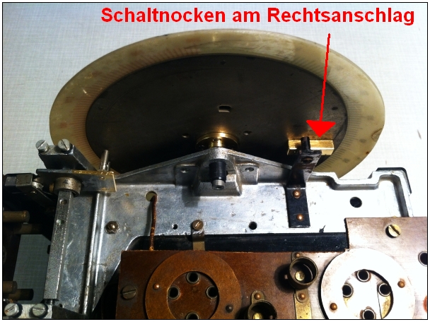 Die Umschaltung des Wellenbereichs erfolgt bei diesem Gerät NICHT durch ein nach draußen geführtes Bedienelement, sondern durch einen Schaltnocken auf der Rückseite der Skalenscheibe. Beim Übergang von der schwarzen (MW) zur roten Skalenteilung (LW) greift dieser Nocken in eine Schaltwippe (im folgenden auch als Rastplatte bezeichnet) ein, die den Wellenschalter umwirft. Dieser direkt über dem Betriebsartenschalter liegende Wellenschalter wird später noch im Detail beschrieben werden.