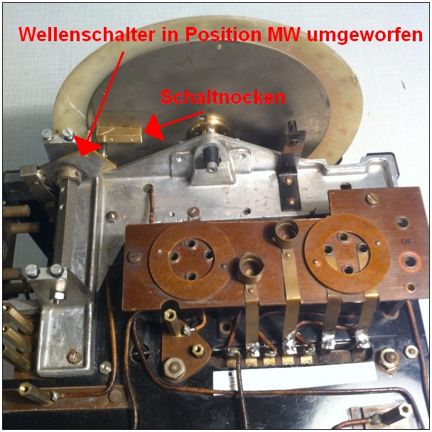 3. MW - Bereich - schwarze Skala '90' oben. Schaltnocken hat den Wellenschalter umgeworfen und steht jetzt etwas oberhalb der Zapfen.