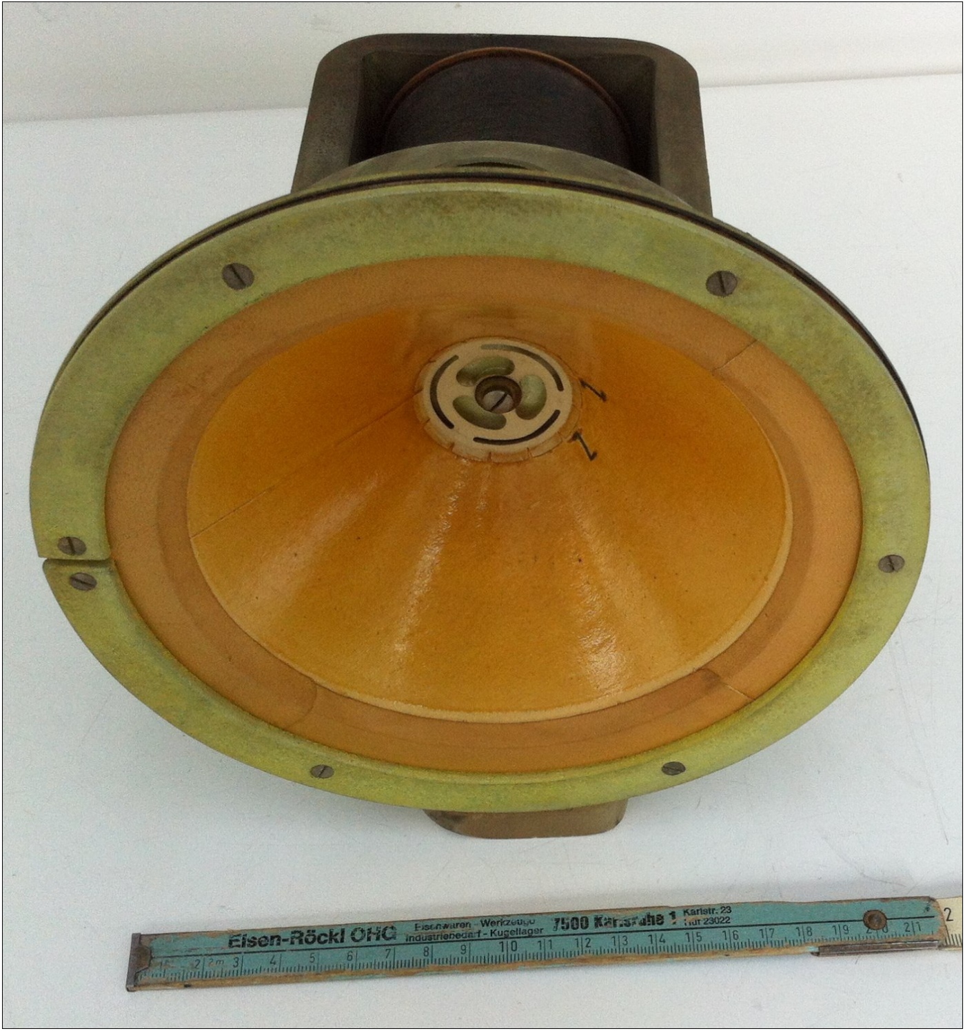 Frontdurchmesser: 21 cm, Einbautiefe: 19 cm, Feldspulenlänge: 9cm, Durchmesser der Schwingspule: 4cm(!) Gewicht: 6,8 kg. An der Feldwicklung messe ich bei meinem Exemplar einen Gleichstromwiderstand von 4kΩ - die Telefunken-Dokumentation nennt: 3kΩ.