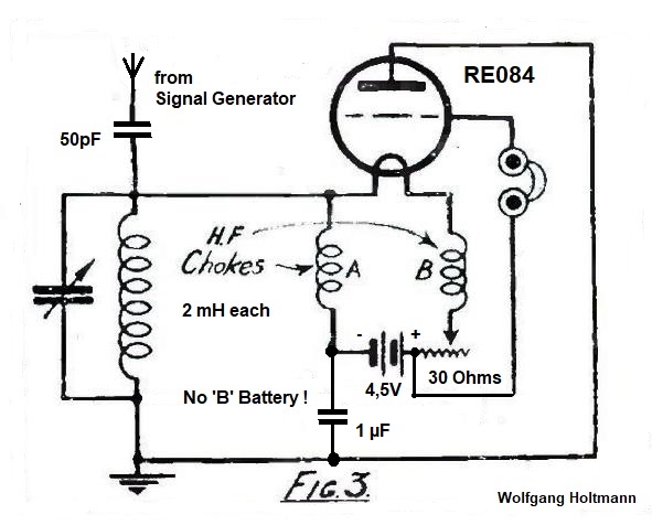 It becomes obvious that the HT source between the anode and grid must not exceed a certain level. Therefore a small amount was sufficient in my trial!