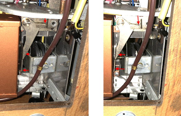 Chassis am besten ausbauen, Bewegung der Mechanik kontrollieren. Dann kann man genaueres sagen. Detail Bild von der Unterseite: UKW Taste betätigt über Winkelhebel und Druckstift die Kupplung. Links UKW, Rechts AM