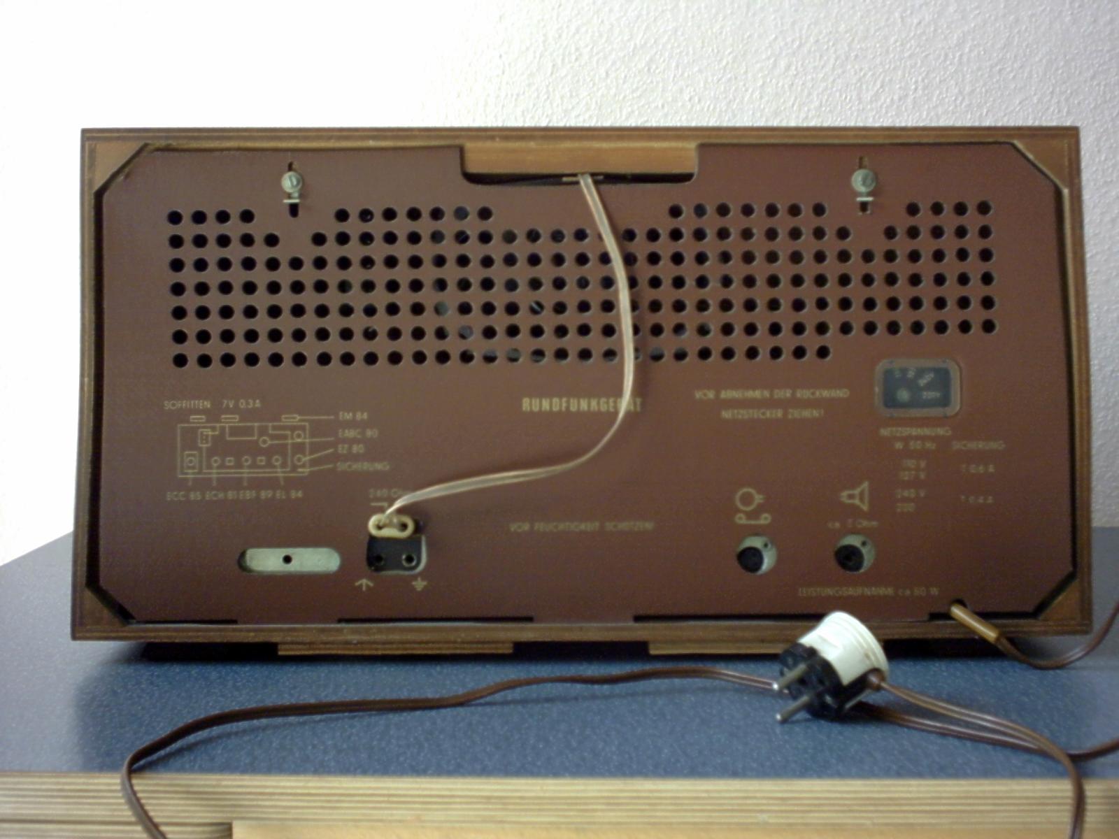 wir hatten mit unserer Vermutung recht: Es stand an keiner Stelle Grundig - es war eine Annahme. Ich hatte den Verkäufer angemailt und er hat mir freundlicher Weise ein Bild der Rückwand gemailt. Es ist wohl das Neutralgerät für jede Firma in Billigstausführung da ohne TB und 2. Lautsprecher - einzigster Hinweis "Rundfunkgerät". Wer wäre darauf gekommen.