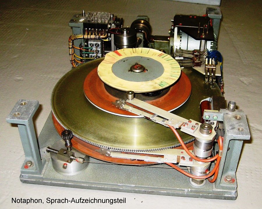 Der erste marktfähige Apparat sei trotz 50 Jahre Patentliteratur erst 1946 erschienen. Dies zur automatischen Wiedergabe von Telefongesprächen bzw. Telefonaufzeichnungen bei nicht besetzter Zentrale (früher Telephon).