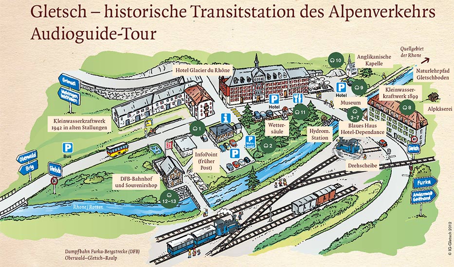 | Description | Erlebnis GletschDie Kleinsiedlung Gletsch besitzt ein geschütztes Ortsbild von nationaler Bedeutung:Anglikanische Kapelle (Baujahr 1908), Ausstellung "Landschaft am Rhonegletscher im Laufe der Jahrhunderte", InfoPoint, Kleinwasserkraftwerke (1899 und 1942), Alpkäserei, Naturlehrpfad, restaurierte Wetterstation (1903) sowie historisches Hotel Glacier du Rhône mit Selbstbedienungsrestaurant und traditionell eingerichteten Nostalgie-Zimmern Geführte Besichtigung in GletschSie können im InfoPoint in Gletsch ein Gerät "AudioGuide" mieten. Dann können individuell die wichtigsten Sehenswürdigkeiten mit deutschsprachigen Erläuterungen besichtigenBlauhausfrüher Dépendance des Hotels Glacier du Rhône, seit 2002 im Besitz der Dampfbahn Furka-Bergstrecke; beherbergt heute Ausstellungsräume, Betriebskantine und verschiedene Schlaf- und Aufenthaltsräume für das Personal.Kleinwasserkraftwerk BlauhausHistorische Wasserkraftanlage im Blauhaus; Baujahr 1899; Hersteller Theodore Bell AG, Kriens. Leistung 30 PS, Wassermenge 42 l/Sek., betriebsfähig restauriert.Kleinwasserkraftwerk Glacier du RhôneUntergebracht in der ehemaligen Hotelgarage; Baujahr 1942; ehemals durch Druckleitung vom Totensee auf der Grimselpasshöhe mit Wasser für den Turbinenbetrieb versorgt.Lambrecht‘sche WettersäuleDie Wettersäule in Gletsch wurde 1903 geliefert und entsprach dem Modell III, „Tourist“. Sie enthielt* ein Lambrechts Polymeter, * einen Lambrechts Wettertelegraphen, * ein normales Thermometer und * ein Minimum-Maximum Thermometer. Traditionshotel Glacier du RhôneErbaut 1857 bis 1914 von der Hotelierfamilie Seiler als Gebirgshotel, historisch wertvoller Speisesaal, rustikale Nebenräume und Zimmer mit gepflegter Nostalgie-Einrichtung, SelbstbedienungsrestaurantBahnhof Gletsch DFBIm restaurierten Bahnhofgebäude in Gletsch sind ein Billettschalter mit Wartsaal, die Toiletten und der Souvenir-Verkaufsshop untergebracht. Der Zugang zu den Zügen ist rollstuhlgängig.Anglikanische Kapelleerbaut 1907/08 nach Plänen von Hotelier Josef Seiler, ein neugotischer Bau mit Glockentürmchen und steilem Dach.Naturpfad im GletschbodenDie Stiftung Landschaftsschutz Schweiz hat in diesem Gletschervorfeld einen Naturpfad angelegt, eine spannende Wanderung über sechs Stationen: Moränenwälle aus unterschiedlichen Epochen; Pionierpflanzen, welche die Dynamik des Gletscherflusses Rotten im Quellgebiet der Rhone erkennen lassen; Tiere im und am Bach; Feuchtzonen und Flachmoore. |