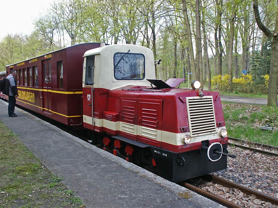 | Description | Wikipedia.deGeschichteDie Bahn wurde am 1. Juni 1954 als Pioniereisenbahn (PE) Cottbus eröffnet. Zum Start betrug die Streckenlänge 1,1 km von Bahnhof Freundschaft (jetzt Stadion der Freundschaft) zum Bahnhof Tierpark (jetzt Zoo).Vier Jahre später kam ein weiterer Kilometer Strecke zum Bahnhof Friedenseiche (jetzt Park & Schloss Branitz) hinzu. Der erste große Umbau erfolgte zum Start des Aufbaus der Bundesgartenschau 1995. Es wurden neue Gleise, Brücken und der Bahn- und Betriebshof „Sandower Dreieck" errichtet. Am Bahnhof Zoo besteht direkter Zugang zum Fürst-Pückler-Park Branitz, und der Bahnhof Messe liegt direkt neben dem Stadion der Freundschaft von Energie Cottbus. In ihrer über 50-jährigen Betriebszeit beförderte die Bahn mehr als fünf Millionen Fahrgäste. Betreiber der Parkeisenbahn ist einmal der Verein zur Förderung der Cottbuser Parkeisenbahn e.V., welcher etwa 84 Mitglieder (Stand 2010) hat, davon etwa 35 Kinder und Jugendliche. Bis Ende März 2011 war außerdem noch die Congress, Messe und Touristik (CMT) Cottbus Betreiber der Parkbahn, seit dem 1. April 2011 ist es die Cottbusverkehr GmbH. FahrzeugeIm Fuhrpark der Parkeisenbahn Cottbus befinden sich zwei Dampflokomotiven, vier Diesellokomotiven und ein modernerer Dieseltriebzug (ICE).Lok 01 - BrigadelokIm Ersten Weltkrieg wurden für die Heeresfeldbahnen mehr als 2500 vierachsige Brigadelokomotiven mit 600mm Spurweite gebaut. Weil der Krieg bei Auslieferung der Lok bereits zu Ende war, kam sie in ein Demobilisierungslager, da das weitere Bestehen von Eisenbahntruppen durch den Versailler Vertrag untersagt war. Die dort gesammelten Lokomotiven wurden allesamt an Fabriken, in die Landwirtschaft oder an andere Eisenbahnverwaltungen verkauft.Die Lok mit der Nr. 2257 wurde im Jahr 1918 bei Linke-Hofmann-Werke (LHW) in Breslau unter der Fabriknummer 1739 hergestellt. Lok 02, Typ DG 26Sie ersetzte die ausgefallene Kö 0409 und wurde ebenfalls von der Waldeisenbahn Muskau übernommen. Sie gehört zur Typenreihe DG 26 und wurde 1934 von Henschel & Sohn unter der Fabriknummer D-1056 gebaut.Lok 03Die Lok wurde 1956 mit der Fabriknummer 248448 beim Lokomotivbau Karl Marx Babelsberg (LKM) gebaut, wobei sie noch im selben Jahr vermutlich im RAW Dessau umgebaut wurde. Sie erhielt eine antriebslose Achse, die fest im Rahmen gelagert wurde, man spricht hier von einer Achsfolge 1B. Dazu musste u.a. der Rahmen der dieselmechanischen Lokomotive verlängert werden.Lok 04 „Graf Arnim"Die Lok 04 war ehemals bei der gräflich Arnimsche Kleinbahn in Muskau als Graf Arnim im Einsatz. Als Besonderheit verfügt sie über einen Tender.Lok 05Diese 30-PS-Feldbahndiesellok vom Typ Ns 2 f (LKM Fabriknummer 248668 / 1955) stammt aus dem ehemaligen Feuerfestwerk Rietschen.„ICE" Nr. 299 010 und 299 011Seit der Bundesgartenschau 1995 sind zwei Triebköpfe und fünf Wagen aus Essen in Cottbus im Einsatz.Von 1966 bis 1992 verkehrten sie als Grugabahn im Grugapark Essen. Dort verkehrte ein Triebkopf mit fünf weiteren Wagen als Einrichtungszug auf einem Rundkurs. Beide Triebköpfe bilden mit zwei Mittelwagen den Triebzug für die Parkeisenbahn Cottbus. Wagenparkim Einsatz, Stand 2010:sieben offene vierachsige Drehgestellwagen fünf geschlossene vierachsige Drehgestellwagen ein vierachsiger Salonwagen ein vierachsiger geschlossener Packwagen ein vierachsiger Arbeitswagen (Plattenwagen) mehrere zweiachsige Wagen (Loren) Untergebracht sind die Wagen, wie auch die Lokomotiven, in der großen Lok- und Wagenhalle im Bahnbetriebswerk der Parkeisenbahn Cottbus am Bahnhof Sandower Dreieck. |