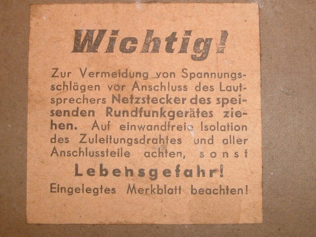 Wehrmacht-Lautsprecher im Pappgehäuse mit modifiziertem DKE-Lautsprecher. Tischgerät, auch Wandmontage möglich durch Langloch in der Rückwand. System mit Universalspule hat Abgiffe für unterschiedliche Impedanzen von 700 Ohm, 3500 Ohm, 7000 Ohm, 12000 Ohm.