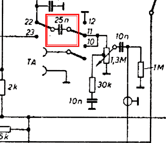 bei meiner Kondensatorkur dieses Gerätes bin ich im Schaltplan auf einen Kondensator gestoßen der bei mir komplett fehlt. Seltsamerweise spielt das Gerät trotzdem (wenn auch immer noch sehr schlecht). Mein Problem ist nun der Einbau dieses C´s. Ein Anschlußpunkt ist mir klar. Er muß an Punkt 22 des Schiebeschalters (siehe Schaltplanauszug). Allerdings konnte ich den zweiten Anschlußpunkt (10,11,12) im Radio noch nicht lokalisieren. Welche Aufgabe hat dieser Kondensator überhaupt? Es scheint ja auch ohne zu funktionieren?