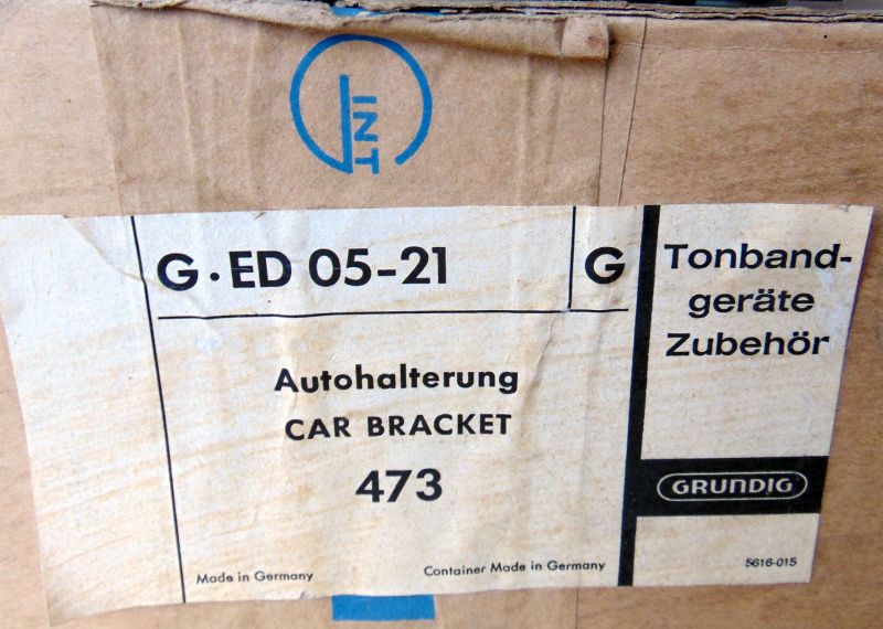 Container Made in Germany steht auf dem Aufkleber rechts unten (Bild a1) und auf der Unterseite des Einlegebodens (Bild b2) der Verpackungsschachteln der Autohalterung und ihrer Zurüstteile (Verstärker etc), luftentzogen eingehüllt auf der mit dem Einlegeboden fest verbundenen Folie. Deutsche Qualitätsarbeit um 1970 auch im Verpackungswesen, bei Grundig unter der Sparte Tonbandgeräte Zubehör.