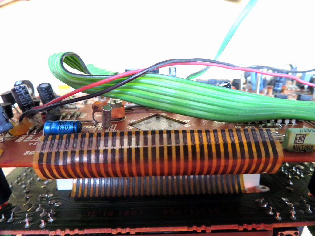 bei der Reparatur des SonoClock 1000 hat sich herausgestellt, dass die LCD-Anzeige deswegen nicht richtig funktionierte, weil ein Zinntropfen zwei Leiterbahnen kurzgeschlossen hat. Beim Entfernen des Zinntropfens hat sich das Flachbandkabel von der Leiterplatte gelöst. Offenbar war es nicht gelötet sondern anders kontaktiert worden. Da der Kunststoff nicht hitzebeständig zu sein scheint, wie das Loch in Bild 2 zwischen der Leiterbahn 1 und 2 von rechts zeigt, scheint Löten nicht zu funktionieren.