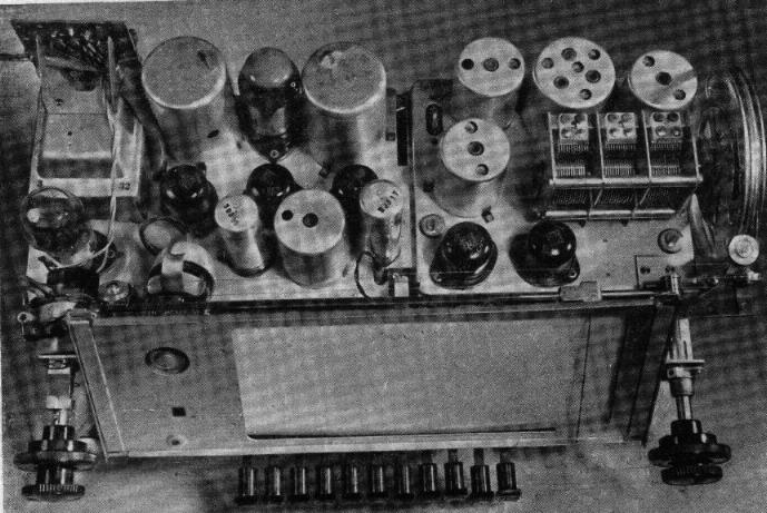 Die selbsttätige Verstärkungsregelung wirkt auf 4 Stufen in Vorwärts- und Rückwärtsregelung. Sie wird durch eine handbediente niederfrequente Lautstärkeregelung ergänzt. Die hochfrequente Bandbreiteregelung erstreckt sich nur auf das 3-Kreis-Bandfilter, der tonfrequente Klangregler ist mechanisch mit dem Bandbreiteregler gekoppelt. Eine Doppelbereich-Abstimmröhre erleichtert die scharfe Einstellung, durch einen Präzisionskugeltrieb [Abb. 1] wird eine Feineinstellung ohne toten Gang und mit großer Übersetzung möglich. Bei der Drucktastenabstimmung mit vorabgestimmten elektrischen Kreisen für insgesamt 10 Sender wird die Abstimmung durch eine selbsttätige Scharfabstimmung ergänzt. Eine veränderliche frequenzabhängige Gegenkopplung in der Endstufe verbessert die Klanggüte und gestattet eine stetig regelbare Anhebung der tiefen Frequenzen. Ein Zusatzlautsprecher verbessert die Abstrahlung der hohen Töne. Die Leistungsaufnahme des Empfängers beträgt 80 W. [Abb. 2] zeigt eine Ansicht des Empfängers, [Abb. 3] eine Aufsicht auf das Chassis, [Abb. 4] die Druckknopfeinbaueinheit von unten gesehen.