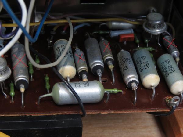 Im Gerät sind in großer Zahl die roten Russischen Kondensatoren /10nf-47nF) verbaut, die nach