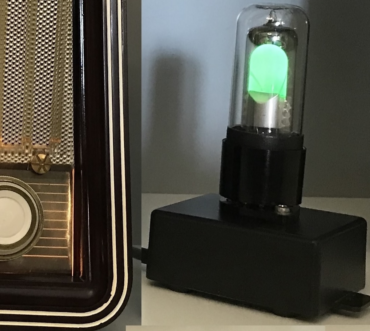 Die UM35 hat einen Oktal Sockel. Für diesen habe ich einen Adapter angefertigt, der von Oktal auf Noval adaptiert. So kann ich auch eine UM80 als Abstimmanzeige einsetzen. Auf die UM80 habe ich die entleerte Glashaube einer EL34 aufgesetzt. So sieht das Ganze auch noch ausgesprochen gut aus. (siehe Fotos)