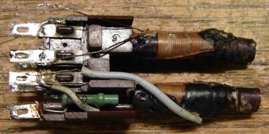 Der alte Wickelkörper war durch Ausbohrversuche inzwischen auch in Mitleidenschaft gezogen, also brauchte ich einen neuen. Die Rettung fand sich in Form eines handelsüblichen Strohhalmes. Der Durchmesser passt genau auf den Haltezapfen. Daraufhin habe ich die bifilar gewickelte Ratiospule von Hand neu gewickelt, die Enden vorsichtig mit Heissleim fixiert (Leimstange und 200-Grad-Lötkolben). Ich empfehle das Verkleben des Strohhalms mit dem Bakelitträger ebenfalls mit Heissleim. Uhu z. B. hält nicht fest genug.