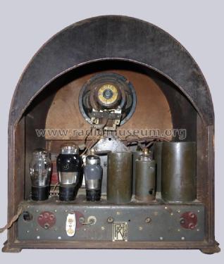 In dark brown stained wooden case with solid brass knobs, illuminated scale, with a numerical layout (0..10) and station names. The knobs from left to right: wave length switch, tuning, on/off/volume. Receives on medium wave (192-570 meters) and long wave (770-1920 meters). At the rear are two antenna connections, a ground, a tone switch, a connection for an additional loudspeaker and a pick-up connection. The mains voltage can be set by means of a porcelain plug with a built-in fuse.