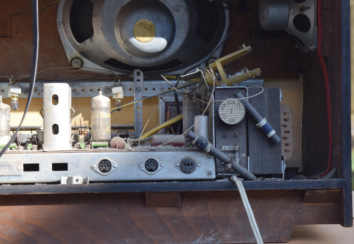 Vor kurzem bekam ich das M14-C von Elprom KB Sofia, der Zustand ist positiv und negativ. Das Gehäuse ist rechtb gut erhalten, etwas Auffrischung ist nötig. Das Chassis dagegen ist total verstaubt und die Ferritantenne demontiert und gebrochen. Die ECC85 lag dabei, wahrscheinlich konnte der Vorbesitzer diese nicht mehr richtig einsetzen, ohne Spiegel auch schwirig.