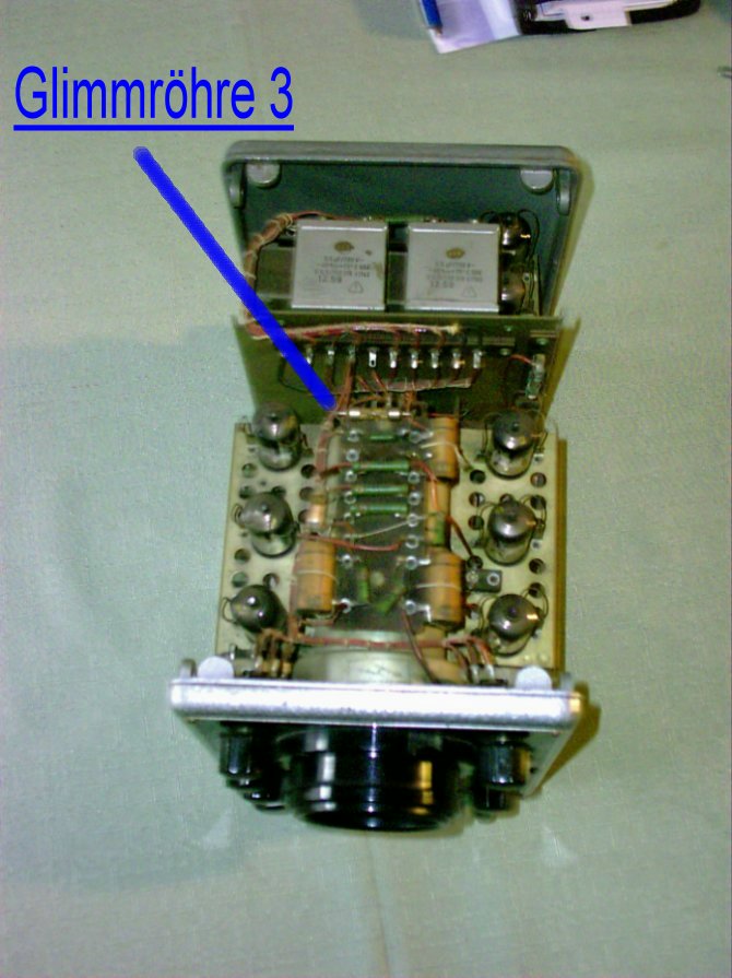 Der Schaltplan birgt mehrere Glimmröhren, von denen GR3 im Bild zu sehen ist. Die Glimmröhre wird im Radiomuseum in den Röhrenlisten der Geräte nicht genannt, da sie in Radiogeräten höchstens zur Spannungsbegrenzung o.ä. verwandt wird.