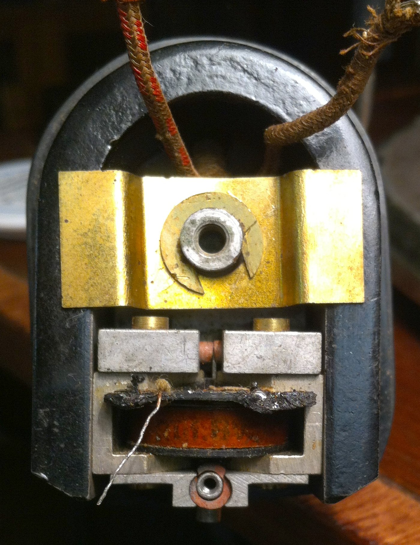 Zwischen den unteren Enden des Hufeisenmagneten liegt die von den zangenförmigen Polschuhen umfasste Pick - Up - Spule. Zentrisch in dieser Spule ist der Schwinganker aufgehängt, aus dessen unterem Ende die Nadel herarusragt (fehlt im Bild). Die der Seitenmodulation der Schallplattenrillen folgende Nadel wird in laterale Schwingungen versetzt. Die von der Nadel auf den fest mit ihr verbundenen Schwinganker übertragenen Schwingungen führen zu einer zeitlichen Veränderung des Magnetfeldes im Innern des Spule und damit zu einer zeitlich veränderlichen Spannung an deren Anschlüssen - das bekannte Wirkungsprinzip eines magnetischen Tonabnehmers.