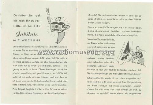 Es gibt zwei Bezeichnungen je nach Jahr: Im Katalog 1954/55: "Jubilate 55 mit Uhr" und im Katalog 1955/56: "Jubilate mit Schaltuhr" (ohne die Jahresangabe). Bemerkung im 1955/56: Ausführung wie Jubilate 6, jedoch mit Schaltuhr, 8-Tage-Federwerk, 24-Stunden-Weckeinstellung. Dabei ist als Gewicht im 1955/56 5 kg erwähnt, im Jahr davor mit 4,5. Auch die Röhrenbestückung wechselt leicht. Das sind die Gründe, warum wir beide Modelle führen. Bitte Bilder von Innenaufnahmen auf das richtige Modell laden.
