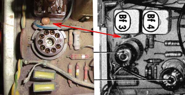 Bei diesem Modell ist der Kondensator C21/330pF so eingebaut, dass er zwischen Abschirmbecher des Ratiofilters und der Fassung der EABC80 eingeklemmt ist.