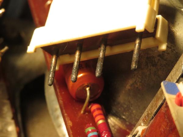 Da das Radio wohl oszilliert, scheint es, muss der Fehler weiter hinten liegen, im Verstärkerteil. Da will ich mit dem Rat des Telefunken-Heftes beginnen und Fehlteile von oben her ersetzen. Bei meiner beliebten ‚Überbrückungs-Methode‘ – man ‚verdoppelt‘ fragwürdige Kondensatoren – werde ich fündig. C301 ist taub. Ich schneide ihn heraus und verlöte auf den Stummeln von oben herab den Ersatz. Alles in Butter! freut sich das dumme Herz. Doch schon fällt das Radio wieder aus. Aha, der Verbindungsstecker: ganz und gar zuoxydiert ist er. Putzen bis es blinkt.