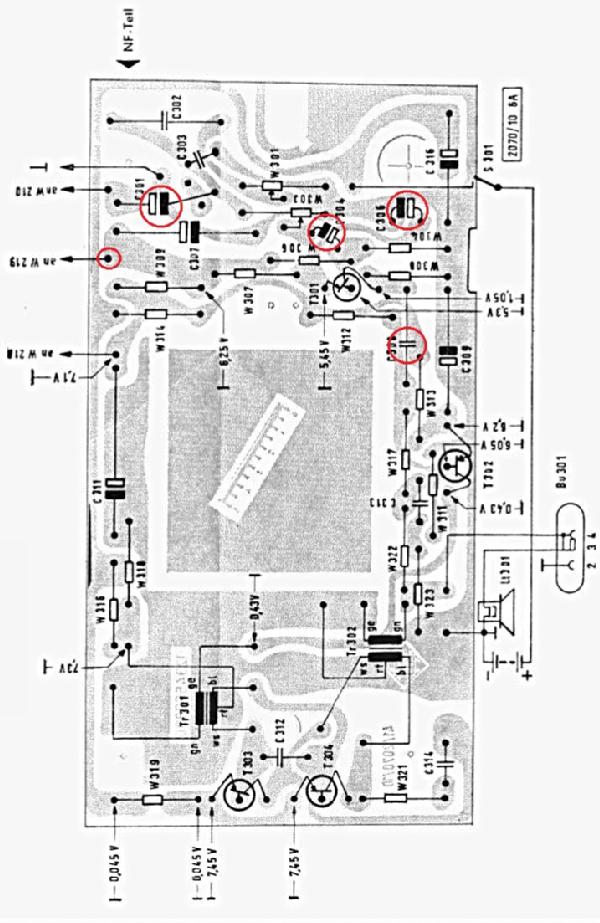 Danach läuft das Radio stabil, aber es ist sehr leise. Es gibt noch 2 Elektrolyten von 5uF, C304 und C308, die werden ebenfalls ausgewechselt. Klar und zuverlässig spielt das Radio – aber nur bei fast Vollaussteuerug. Der andere Kavalier wird hinzugezogen: nein, die Lautstärke des neuen ist völlig ungenügend.