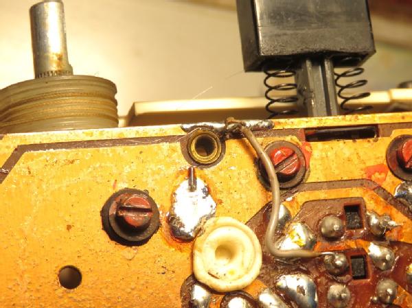 Wie aber schliesslich der Henkel als Antenne fungiert auf Mittelwelle, dafür der Empfang via die Ferritantenne miserabel ist! – und darüber hinaus der Anschluss für die Aussenantenne völlig taub ist? – Was macht man da? Obwohl man sich davor fürchtet, wegen des allgemeinen Gelottere, demontiert man die Platine. Dort, ja dort, ist die Stelle: hier ist die Leiterbahn zur Aussenantenne unterbrochen. Man glaubt es nicht, die Leiterbahn sieht dick und stabil aus – doch der Ohmmeter spricht eine klare Sprache. Man kleistert die Stelle zusammen. Man verschiebt die MW-Spule, jetzt empfängt der Ferritstab und nicht die Teleskopantenne. Man isoliert das Basis-Rohr der Teleskopantenne, damit nicht der Henkel weiter via seine Aufhängung Antenne spielen kann.