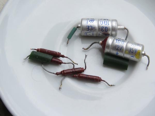 Schnell ‚verdoppelt‘ der Meister die Elektrolyten, um sich eine Übersicht zu verschaffen. Doch wo sind sie? – Der Schaltplan verspricht zwei grosse und vier kleine. Die grossen sind da, aber die kleinen? – Es gibt sie nicht. Aber es muss sie doch geben… Die hübschen silbernen Zwerge dort – es sind Folienkondensatoren. Was aber steckt in der grünen Hülle dort, ja, dieses dunkel-braun-rote Ding? – Das sind sie also, die Elektrolyten von 10uF und 2uF. – Das Verdoppeln verbessert den Klang keineswegs, er ist klapperig wie gehabt.