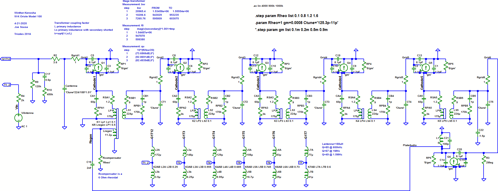 The modeling of this set was done with the free simulator LTspice from Analog Devices (formerly from Linear Technology). Each tube is modeled with a transconductor with a nominal gm=800uS, which is the transconductance spec of the 01A tubes. The mu=8 for the 01A tubes was modeled with an output resistance of mu/gm=10kΩ. The individual interelectrode capacitances were entered from the data sheet as Cgk=3.1pF, Cpg=8.1pF, Cpk=2.2pF. This is only a small signal model. Previous experience modeling 1920's battery sets [1, 2, 3] has shown that the simulations for the overall set line up quite well with measured results, if the individual coil and tube models are first verified against measurement.
