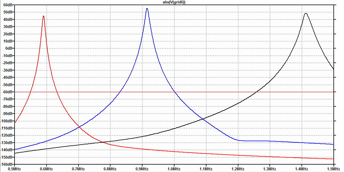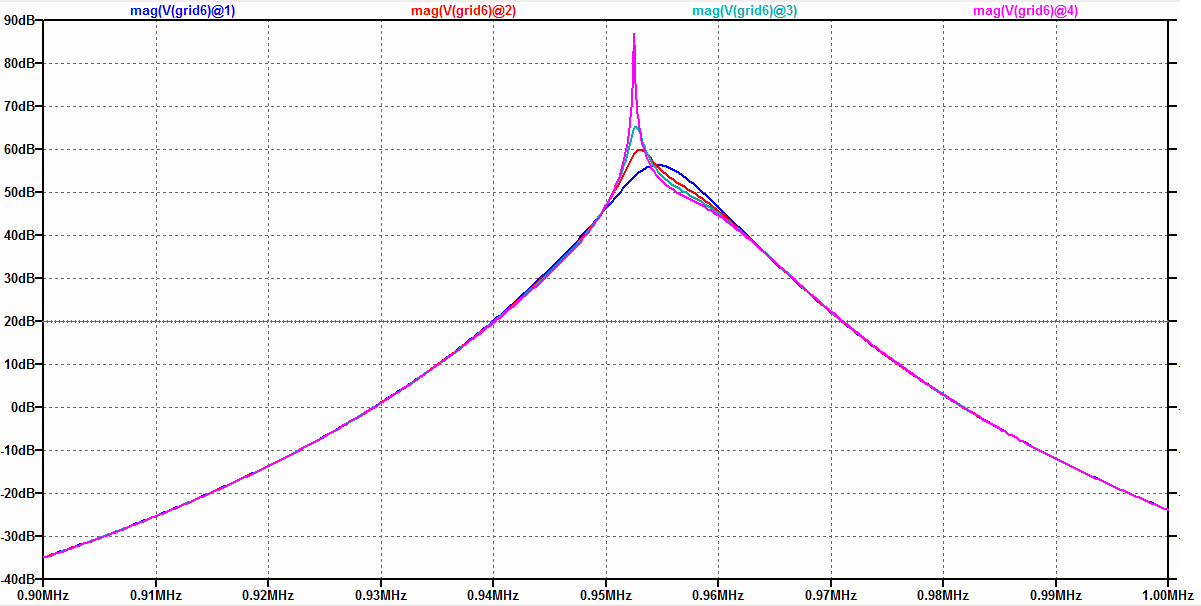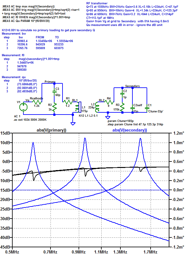 The Step-up transformers were measured with the power off to establish primary and secondary inductances and their coupling factor. The coupling factor K=0.1 was extracted from two inductance measurements of one winding with the other winding first open and then shorted K=sqrt(1-Lshort/Lopen). The Q of each winding is modeled with resistor capacitor networks. The frequency response was measured at 3 frequencies near the top, middle and bottom of the band, at 1.5MHz, 950kHz, 600kHz, because the Q is not constant over the tuning range. The calculation of the resistances required iteration to match the simulated response to the measured response. First the series resistors were entered for the Q at 600kHz, then the series RC branches were added to lower the Q at 1.5MHz to match the high frequency response Q. When the RC branches were added, the series resistors were lowered slightly to keep the combined Q correct at 600kHz. Fortunately, this exercise was done only once for the 5 identical stages.