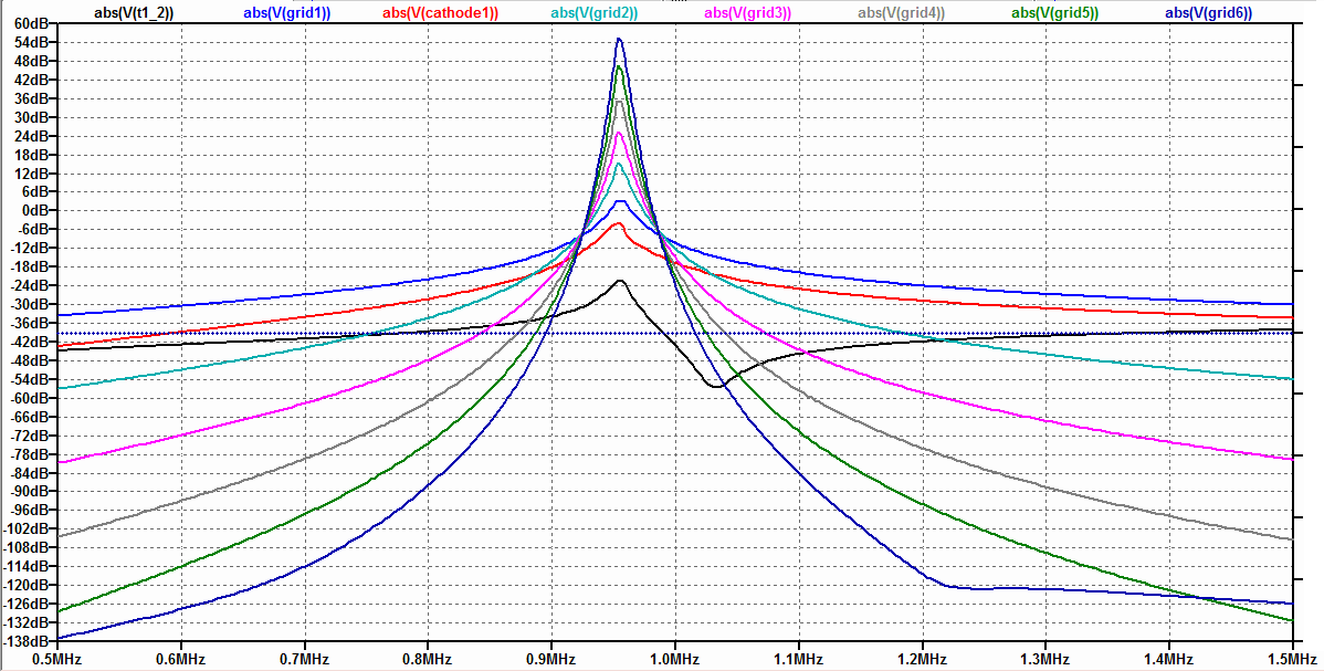 For example, the 37x step-up ratio transformer for the second stage of the model 71 has the lowest impedance primary, which means it is the most loosely coupled of the designs, and therefor the most selective - loaded Q is nearly the same as the unloaded Q. The attenuation from the grid to the cathode at this stage is 1/16x for a combined stage gain of only 2.3x. Note that the step-up ratio of the tuned transformers is much higher at resonance and not directly related to the turns ratio. By contrast, The third stage of the model 71 uses an untuned laminated iron transformer where the step-up ratio is set by the turns ratio and is independent of frequency. It's input impedance is much higher than the 1.2kΩ source impedance of the follower cathode, so that the attenuation at the cathode from transformer loading is only 0.9x. But keep in mind that the mu=8 for the 01A triode also limits the unloaded cathode follower gain to 0.88 because of the internal tube resistance loading from cathode to plate, which is mu/gm=8/800uS=10kΩ.