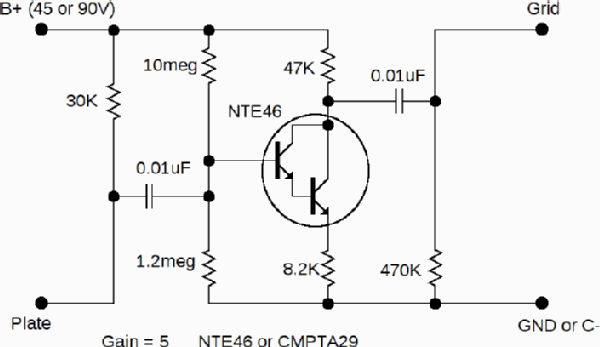 This version has a voltage gain of 5; transformers from the detector to first audio tube frequently have this 1:5 ratio. Changing the 1.2 Meg to 1.6 Meg and the 8.2 K to 12 K changes the Gain to 3.5; appropriate for use between the first and second audio amplifier tube. Mr. Kinnard pointed out that there may be some circuits where the ‘C’ bias is obtained from a high impedance source. If that is the case, there is a trace on the circuit board that can be broken to isolate the 470 K resistor from the other two resistors on the net. The 470 K can go to –C and the other two resistors to Ground or receiver common.