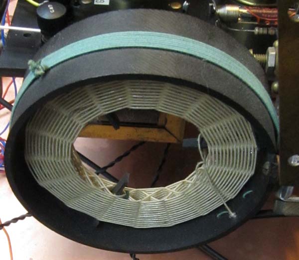 The model 100 uses five identical cathode follower stages with step-up transformers arranged as binocular solenoid pairs. The narrower coil has the bifilar primary wound around a laminated iron core. All five secondaries in the binocular coils are gang-tuned simultaneously with a zero back-lash gear train.
